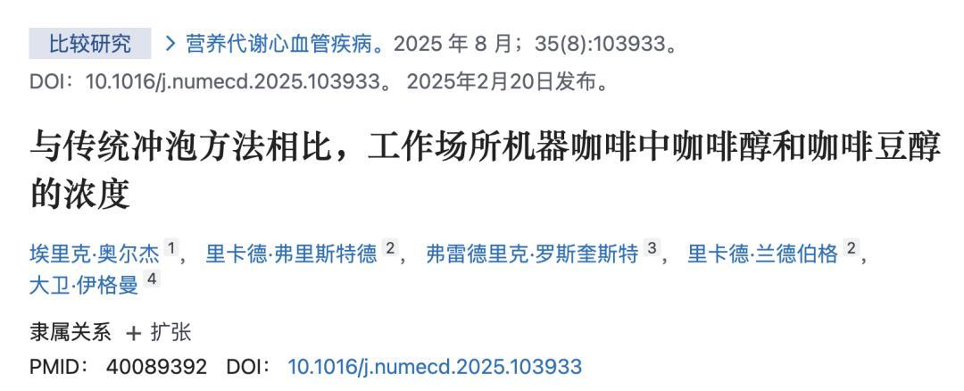 [7]Cafestol and kahweol concentrations in workplace machine coffee compared with conventional brewing methods, Nutrition, Metabolism and Cardiovascular Diseases, 2025.