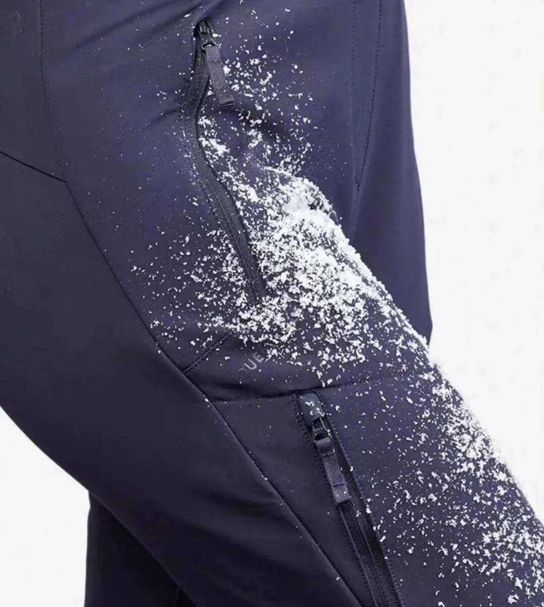 防風面料,磨毛內裏,透氣快乾,表層防潑水,沾點雪渣也不怕。小腿部位帶有鬆緊帶和鉤環,可以防止雪灌進褲腿,雪地行走很實用。