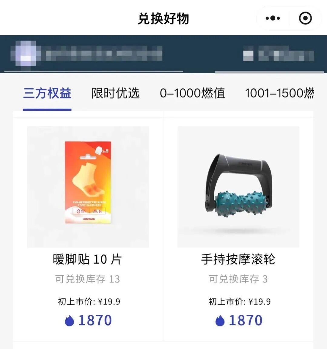 3. 可以用「燃值」兌換,在「迪卡儂會員」小程序裏的「兌換好物」。比如脖套、暖腳貼這兩小玩意就是可以不花錢直接用購物積分兌換;