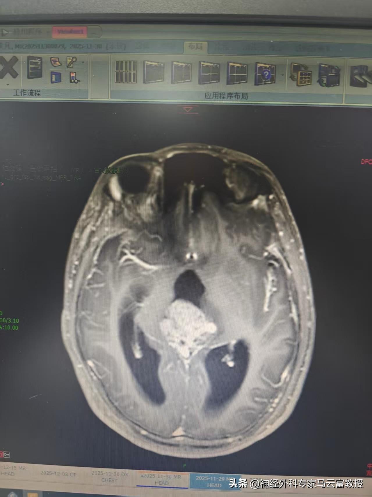 患兒小明(化名)原本活潑健康,近期卻逐漸出現雙眼視力減退,偶有頭暈,並伴有噁心嘔吐。父母察覺異常後,帶其至我院光谷院區就診。經頭顱MR檢查提示:松果體區存在混合信號佔位(考慮生殖細胞腫瘤可能),鄰近背側丘腦受壓水腫,幕上腦室已出現梗阻性腦積水。