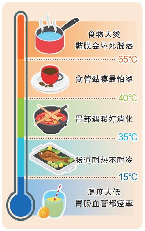 消化道各部位的黏膜厚度不同,對溫度的耐受程度也存在差異,因此,入口的食物溫度有一個最佳範圍。