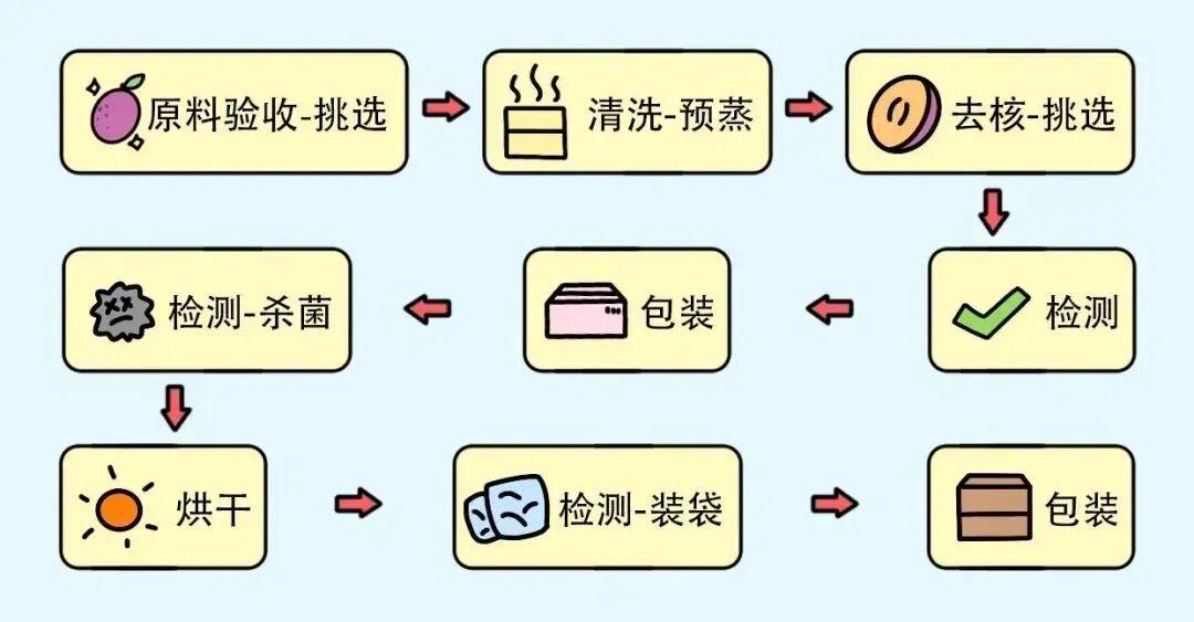 而且,經過預蒸、去核後,再進行殺菌、烘乾等一系列步驟,還可以去除掉微生物,從而達到很好的防腐效果,可以做到 12 個月的超長保質期。