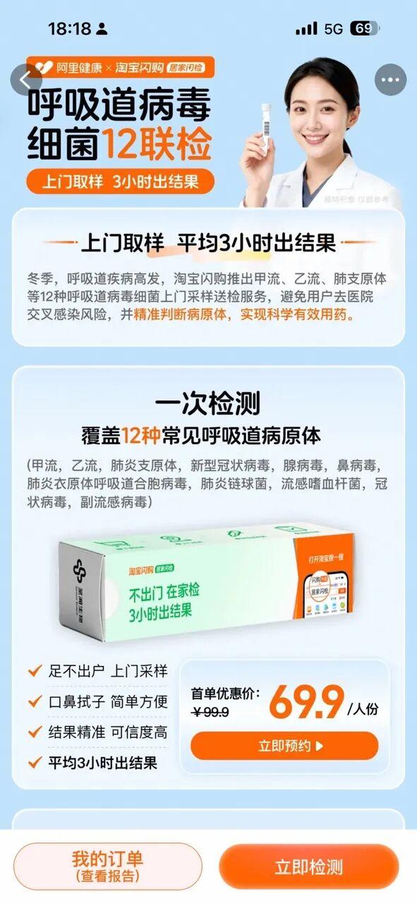 現在在上海、杭州、廣州、北京 、天津已上線:在淘寶閃購 App 一鍵預約;專業培訓的騎手上門送達採樣盒;平均 3 小時出結果