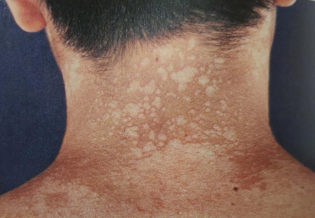 症狀:常見於面頸部、上臂、軀幹等處,出現淡白色、邊界模糊的斑片,皮膚略幹,有時會輕微發癢。