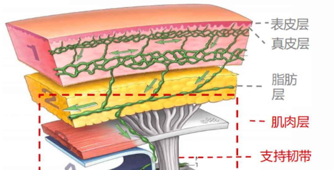 如果把臉想成一頂帳篷,那表皮是外在的篷布,真皮層的膠原蛋白和彈性纖維是篷布的材質。而撐起整張帳篷、維持結構穩固的,是「支撐杆」(肌肉)和「固定繩」(韌帶)。