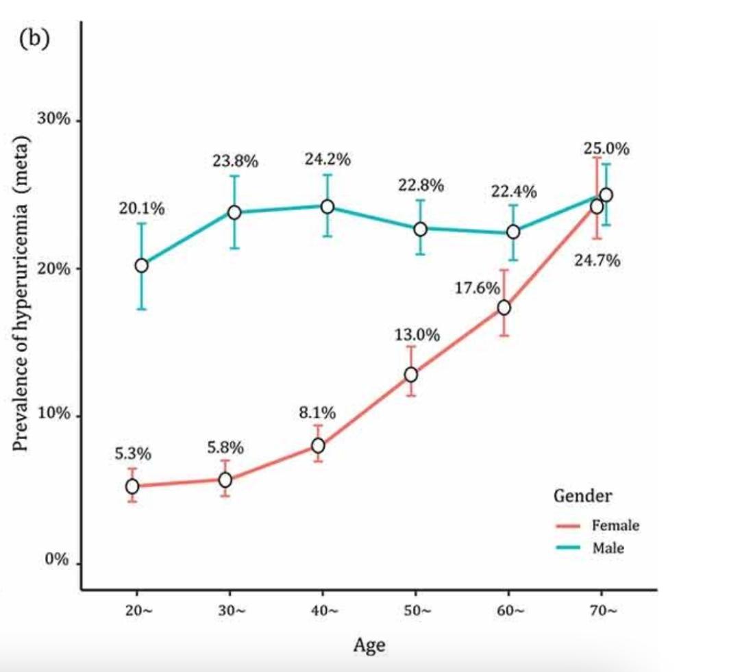 不同年齡段男性和女性的高尿酸血癥患病率,男性整體遠高於女性
