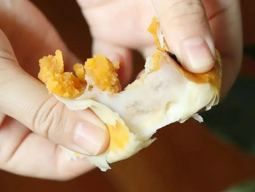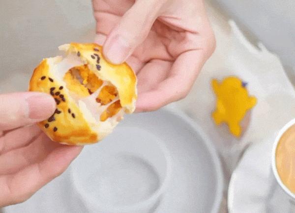 柔韌的酥皮,包裹着軟糯 Q 彈還拉絲的雪媚娘皮,其中又鑲嵌着香甜細密的鷹嘴豆沙、以及最裏面鹹香綿沙的鴨蛋黃......