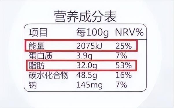 比如下面這款果蔬脆的營養成分表顯示,它的脂肪含量高達32克/100克,能量高達496千卡/100克。