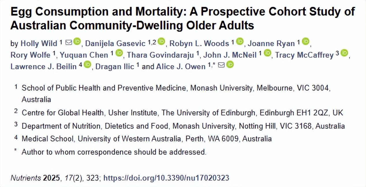 [1]Wild, H.; Gasevic, D.; Woods, R.L.; Ryan, J.; Wolfe, R.; Chen, Y.; Govindaraju, T.; McNeil, J.J.; McCaffrey, T.; Beilin, L.J.; et al. Egg Consumption and Mortality: A Prospective Cohort Study of Australian Community-Dwelling Older Adults. Nutrients 2025, 17, 323.