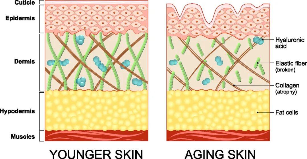 年輕時,這兩種膠原蛋白緊密協作,隨着年齡增長,III 型、I 型膠原會陸續流失,皮膚自然就失去了彈性、細紋增多,慢慢地整張臉機會開始鬆弛下垂。