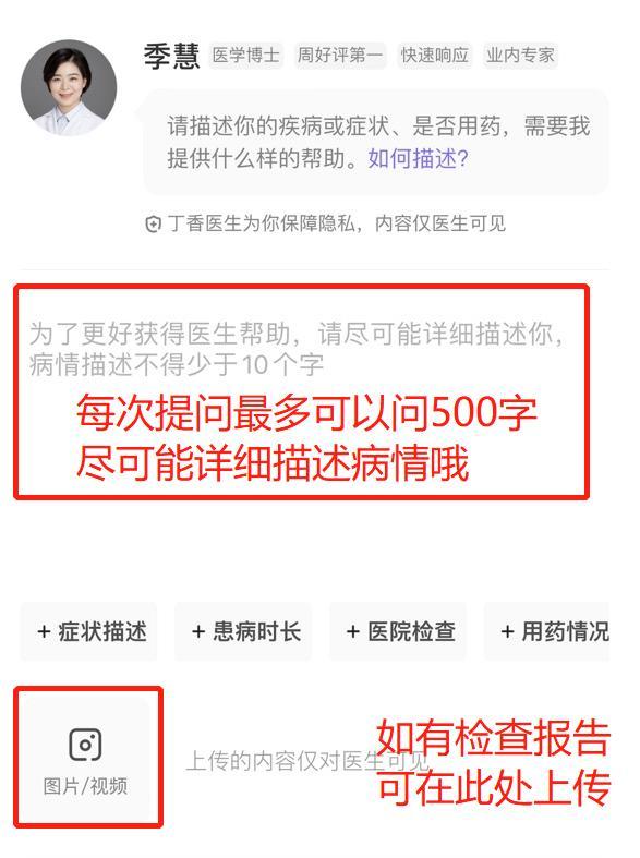 圖文問診包含 3 次提問機會(一次提問兩次追問),每次可輸入多個問題(最多 500 字),支持上傳視頻和圖片(檢查報告、藥品圖片等均可拍照上傳),24 小時內有效。