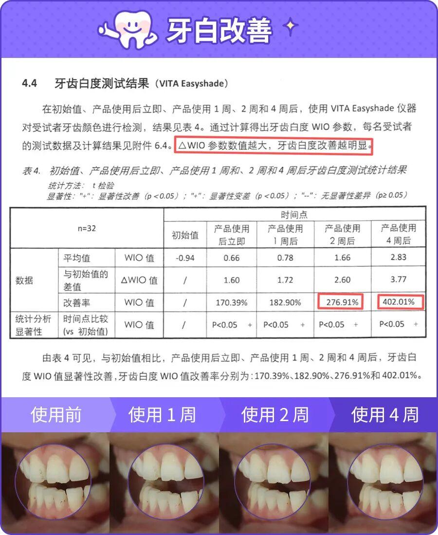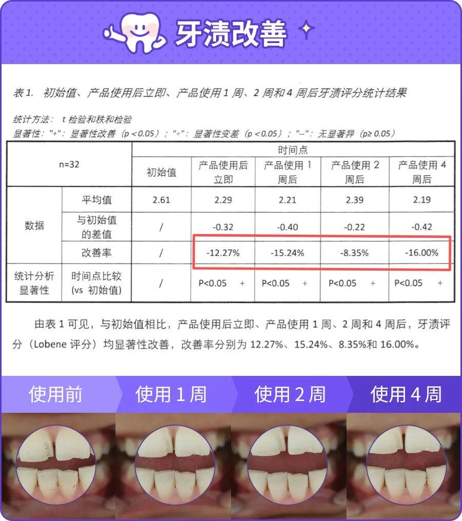 結果顯示,參與口腔測試的使用者,牙漬改善明顯:使用後即刻改善約 12%,4 周改善了 16%。