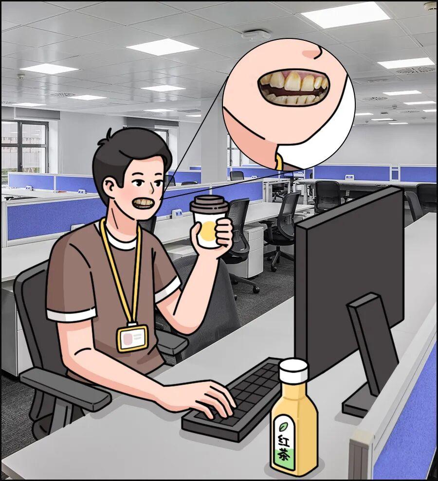 哪怕這些已經是打工人精選過後的健康飲料,其中所含的天然色素和酸性物質,仍會日積月累地附着在牙齒表面,並滲透進牙釉質,導致牙齒外源性着色[1]。