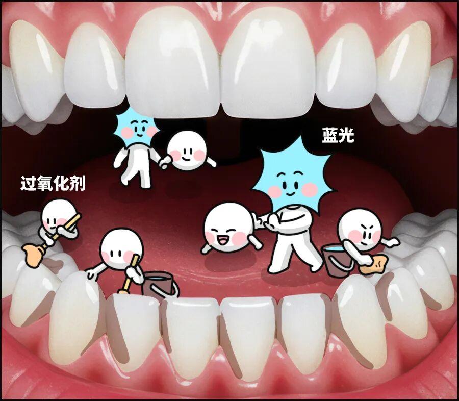而藍光是加速器,幫過氧化氫這樣的氧化劑「提速」,讓它更快分解色素,以提高牙齒美白的效率。