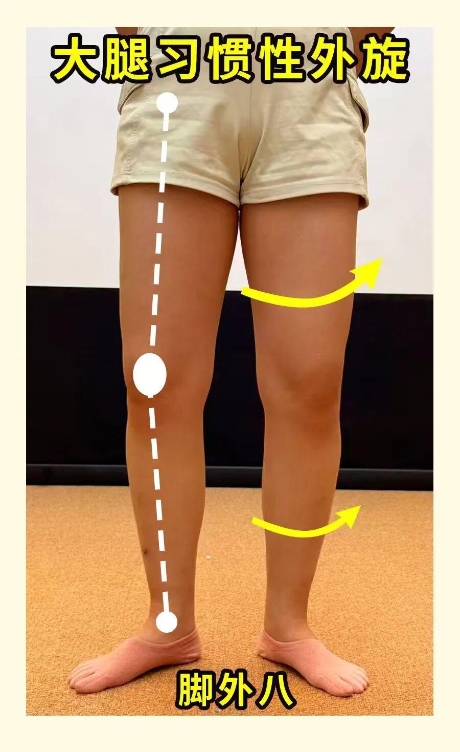 站立時可以稍微留心一下:如果明顯外八或者感覺控制不住大腿總往外撇,往往意味着髖內旋控制不好、臀中肌也是偏弱的;這就導致了身體只好用大腿外側肌肉發力代償來維持穩定。