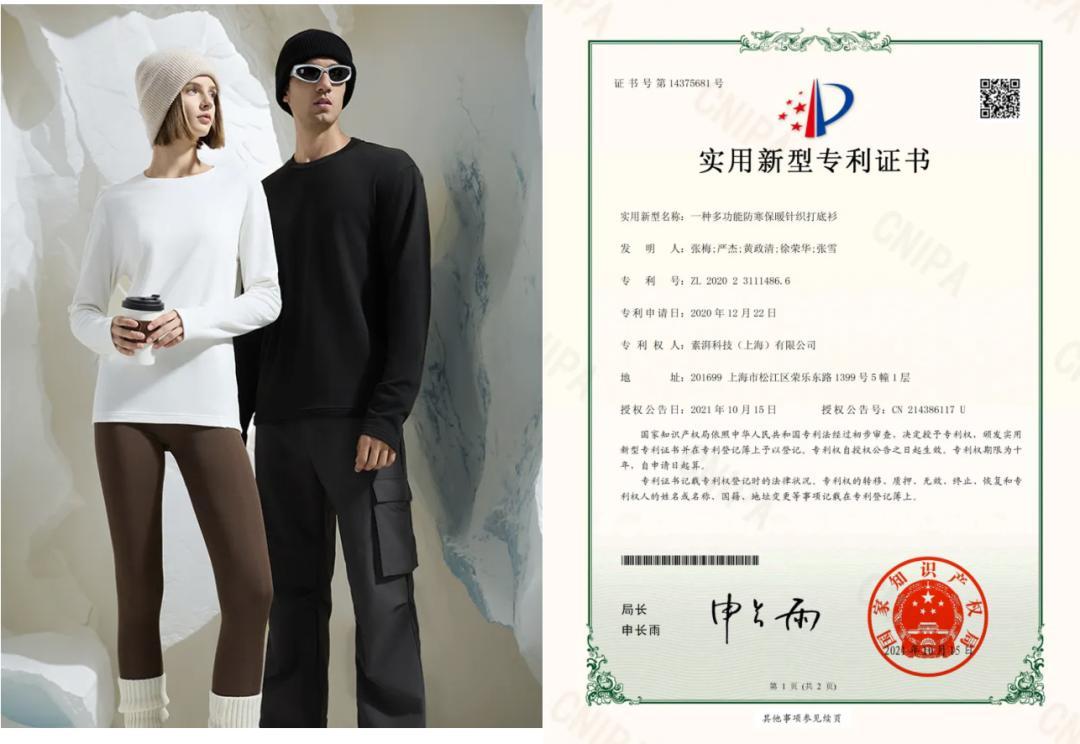 素湃這個品牌,擁有國內外多項專利,背後的技術團隊也很牛,自研了多功能防寒保暖針織打底衫技術,並獲得國家發明專利!
