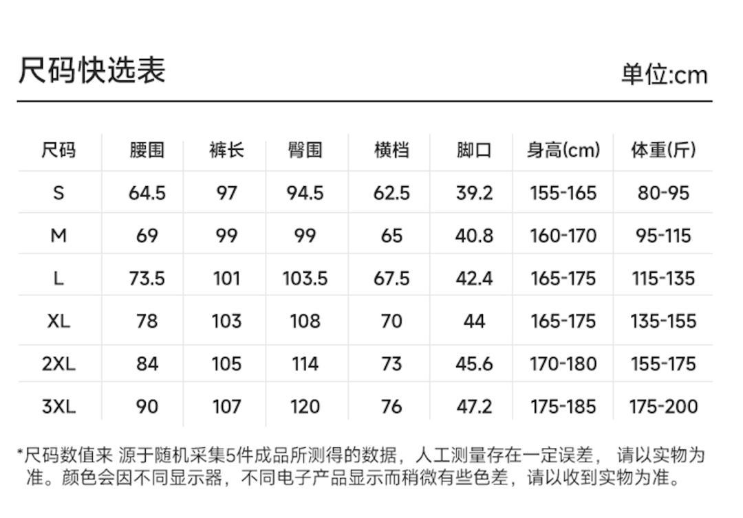 尺碼也覆蓋得很全:S-3XL 都有,身高 155~185 cm ,體重 80 ~ 200 斤都能穿,具體可以參考下面這張圖