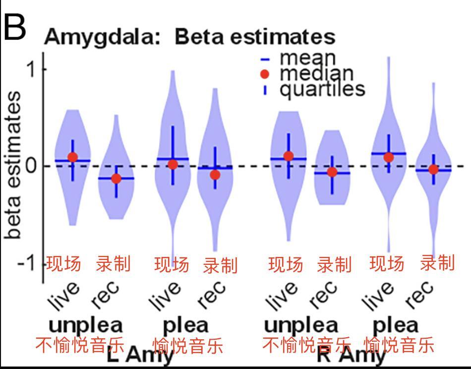 現場和錄製條件下聽不同音樂的左右杏仁核的腦活動圖,現場音樂條件下杏仁核的活動值普遍更高
