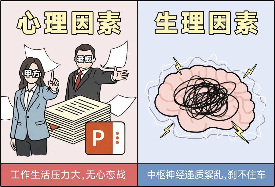 近 20 年來,醫學上發現早泄還與神經因素息息相關,比如大腦中樞神經系統負責下達「暫停發射」指令的 5 羥色胺(5-HT)神經遞質發生紊亂,使控制射精的「神經開關」過於靈敏,難以控制射精時機,導致插入後提早射精,不能達到性滿足。
