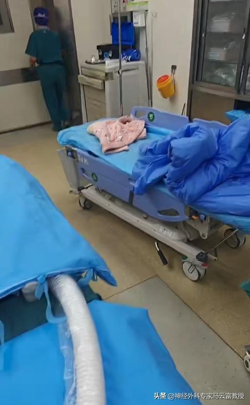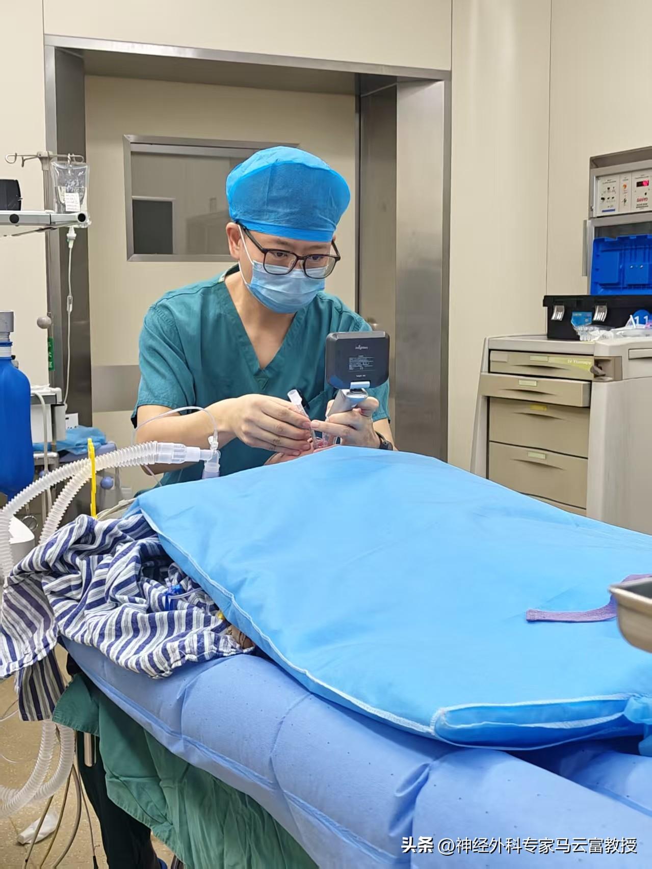 上午8點,手術正式開始。手術燈的光芒聚焦在手術區域,馬雲富主任手持精細的手術器械,在顯微鏡下小心翼翼地操作着。分離頭皮、暴露顱骨、精準鑽孔、探查堵塞的引流管……每一個動作都沉穩而精準,彷彿在進行一場精密的藝術創作。團隊成員默契配合,遞器械、監測生命體徵、調節設備參數,整個手術室內瀰漫着嚴謹而專注的氛圍。時間一分一秒地流逝,窗外的陽光漸漸灑滿大地,手術室內的戰鬥也即將迎來勝利的曙光。