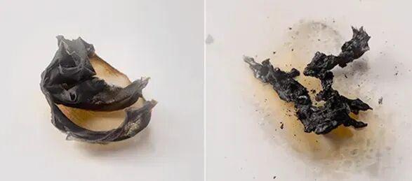 純棉材質遇火即燃,燃燒氣味有點像紙燃味,不刺鼻,也沒有黑煙,最後剩下的是少量的灰色粉末,手指輕輕一碾就碎;而一些化學纖維燃燒時捲曲,有些許刺鼻味,最後剩下的是黑色固體,無法碾碎。