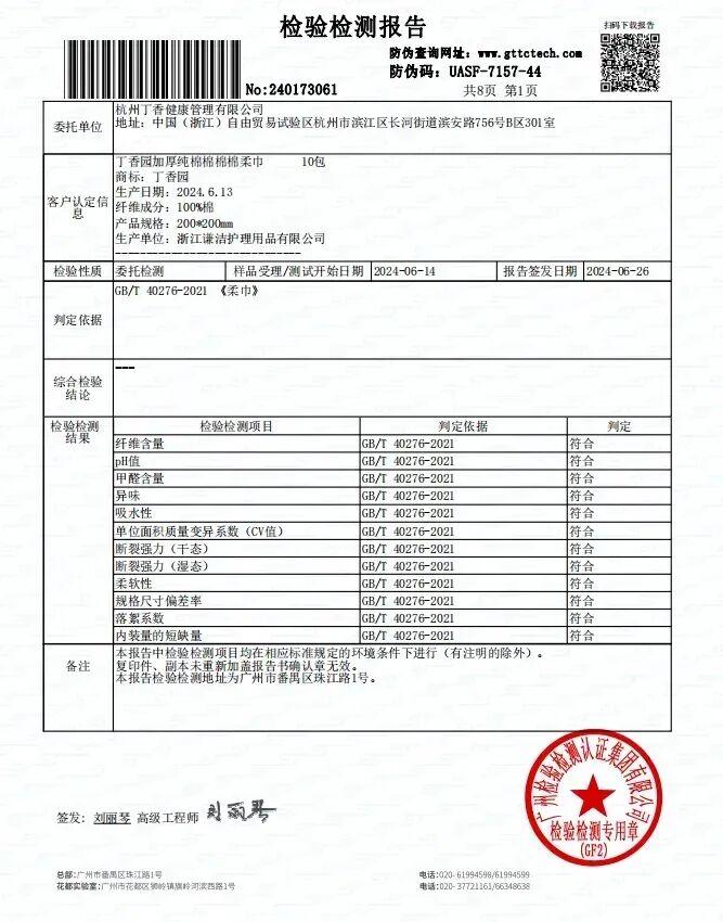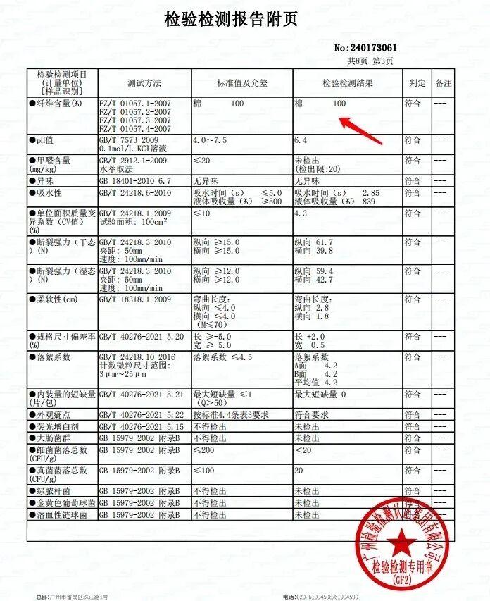 除了自證,這款棉柔巾還有第三方權威檢測報告蓋章:就是 100% 棉。