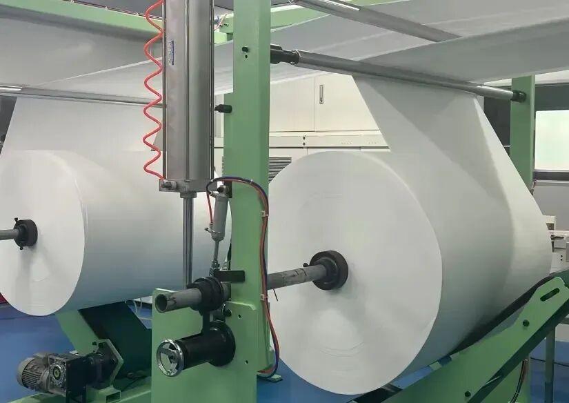 大卷布料在恆溫恆溼的十萬級潔淨車間用機器疊合切割做出我們想要的棉柔巾尺寸