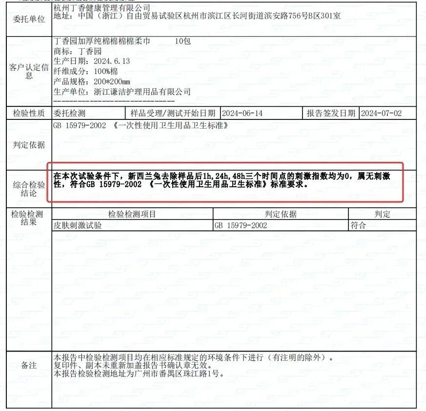 人體皮膚斑貼試驗結果顯示,丁香加厚純棉棉棉棉柔巾,30 人中 0 例出現不良反應;在實驗條件下顯示,新西蘭兔去除樣品後 1 h、24 h、48 h 三個時間點的刺激指數均爲 0,屬無刺激性。