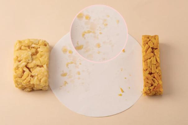 我用手按壓兩款沙琪瑪,絲毫不誇張,傳統沙琪瑪上的油直接給底部的吸油紙整了個大印記。而我們的無糖全麥奶芙沙琪瑪,相對油脂滲出量少很多(甚至可以說幾乎沒有)!
