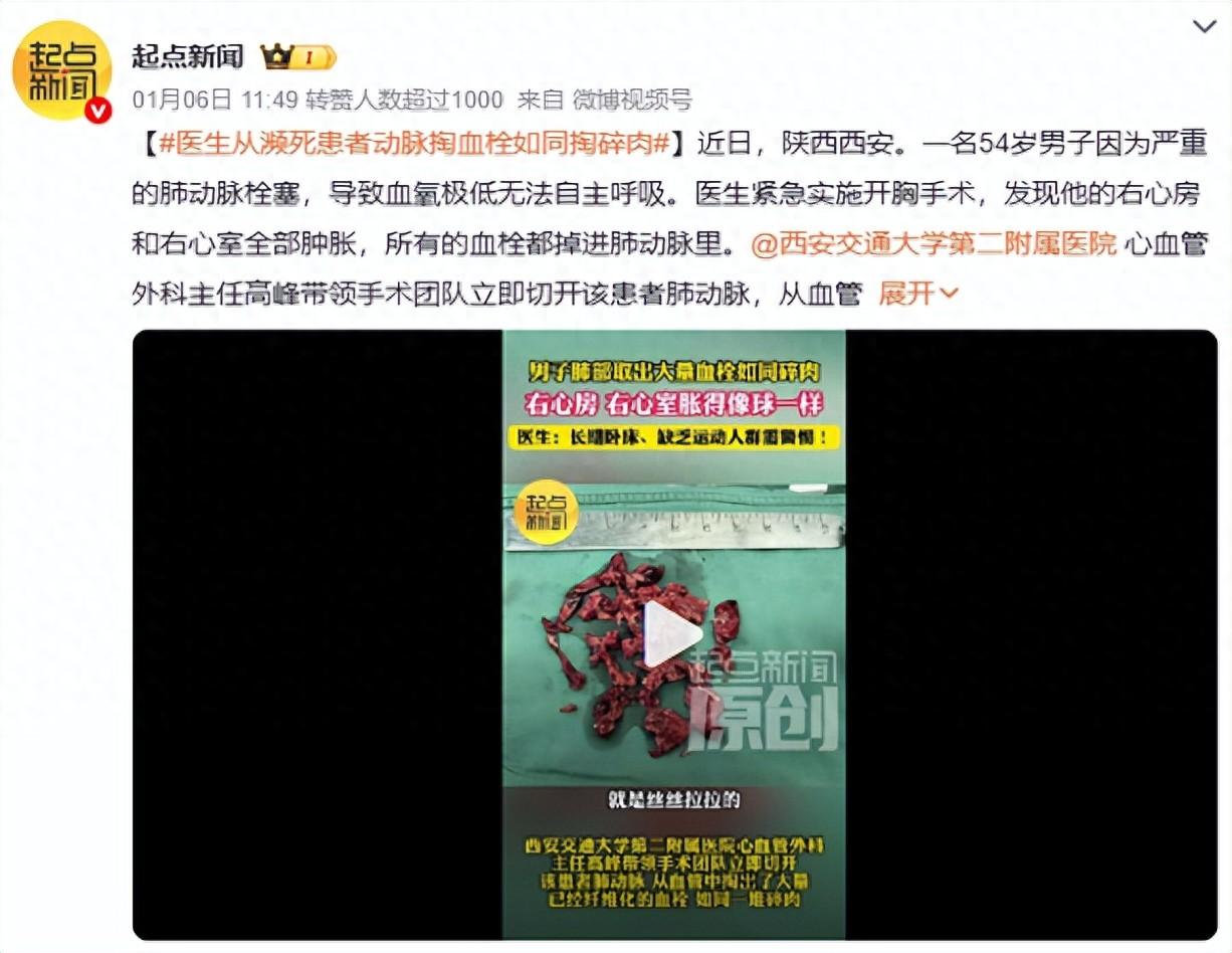 醫護人員緊急爲他開通了綠色通道手術,術中發現肺動脈被血栓完全堵死了,切開血管後發現血栓完全纖維化,如同爛肉一般。