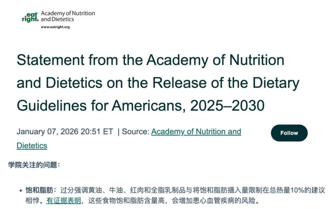 新指南發佈後,「美國營養與飲食學會」緊跟着發表聲明[2],委婉稱: