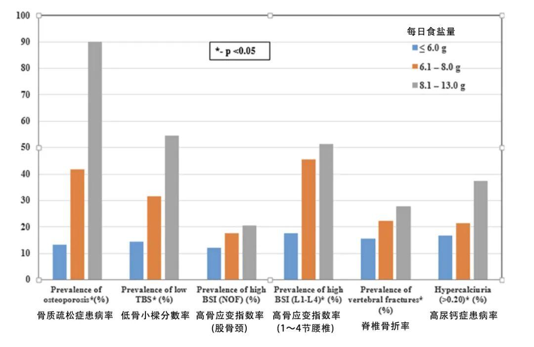 同樣的事情也發生在人身上。2024 年,一項針對 383 名絕經後女性的研究發現,相比起低鹽攝入組,在高鹽攝入組中,骨質疏鬆症、中重度錐體骨折、高鈣尿等 6 個指標的患病率顯著增加。[3]