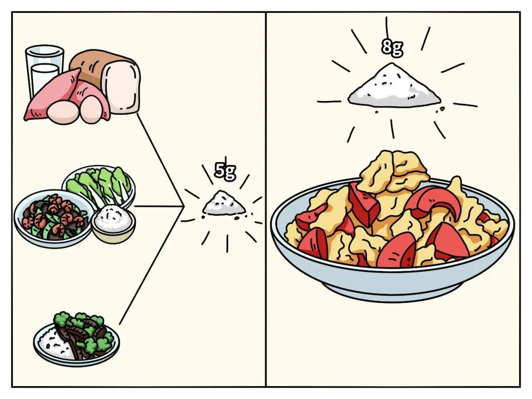 拿某平臺上高贊食譜西紅柿炒雞蛋舉例,其中:鹽 1 勺,蠔油 3 小勺,生抽 1 勺,味精 1 克。換算下來,這一盤西紅柿炒雞蛋的含鹽量就有 8 克,直接幹翻了一天的食鹽攝入量。