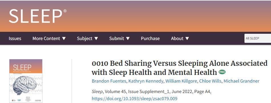 [7]Brandon Fuentes, Kathryn Kennedy, William Killgore, Chloe Wills, Michael Grandner, 0010 Bed Sharing Versus Sleeping Alone Associated with Sleep Health and Mental Health, Sleep, Volume 45, Issue Supplement_1, June 2022, Page A4, https://doi.org/10.1093/sleep/zsac079.009 Health, Sleep, Volume 45, Issue Supplement_1, June 2022, Page A4, https://doi.org/10.1093/sleep/zsac079.009