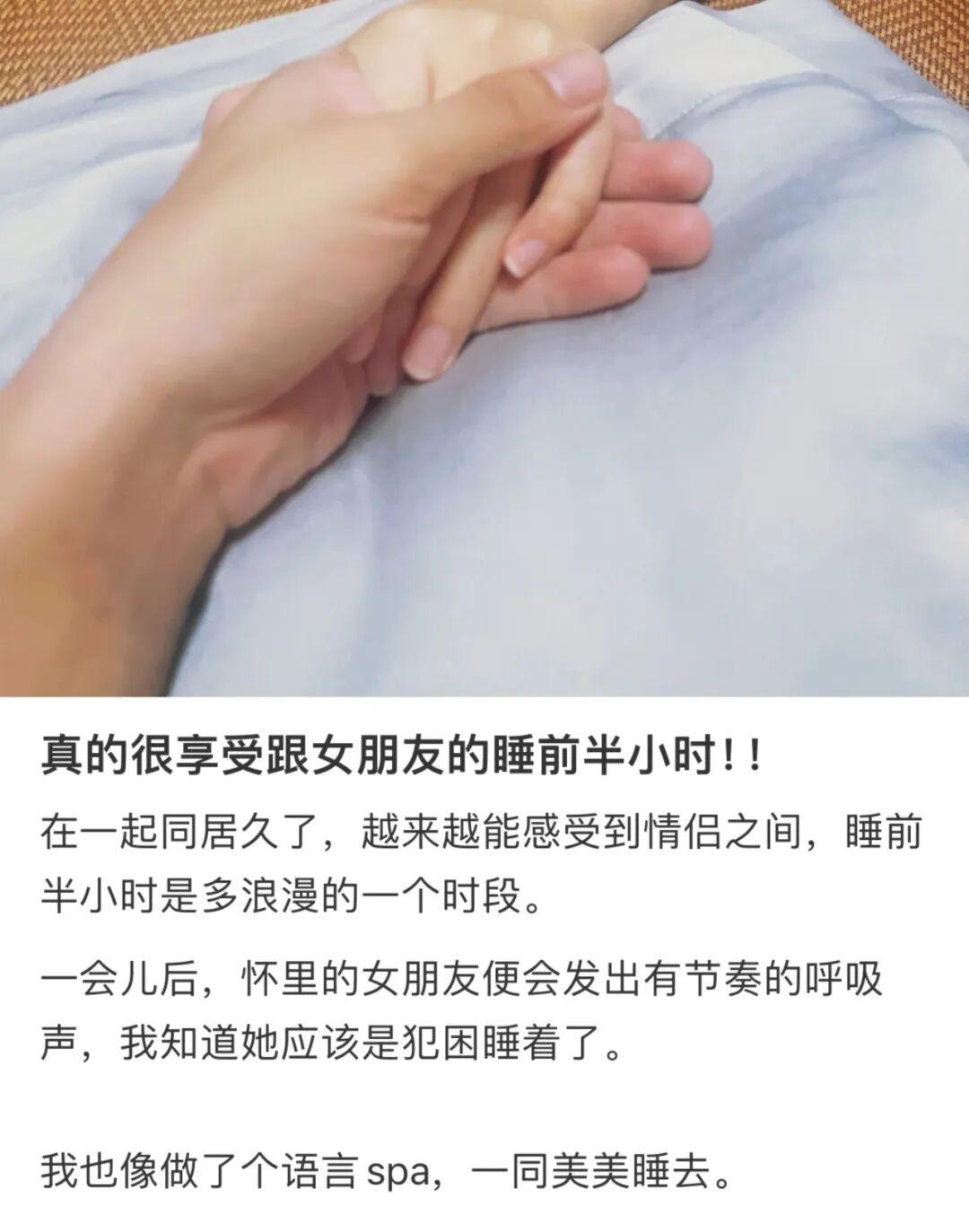 有很多萬贊帖子分享《和伴侶的睡前半小時太重要了》,蹭蹭耳朵,磨磨鼻子,訴說着今天發生的事情,生活的疲憊、工作的壓力在言語中逐漸消散。