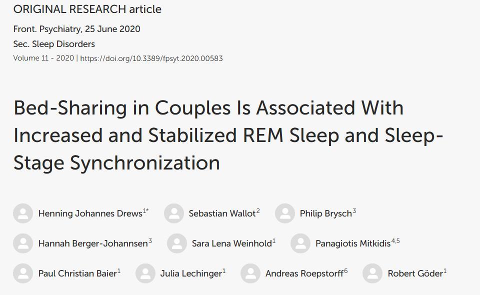 [6]Drews HJ, Wallot S, Brysch P, Berger-Johannsen H, Weinhold SL, Mitkidis P, Baier PC, Lechinger J, Roepstorff A, Göder R. Bed-Sharing in Couples Is Associated With Increased and Stabilized REM Sleep and Sleep-Stage Synchronization. Front Psychiatry. 2020 Jun 25;11:583. doi: 10.3389/fpsyt.2020.00583. PMID: 32670111; PMCID: PMC7330166.