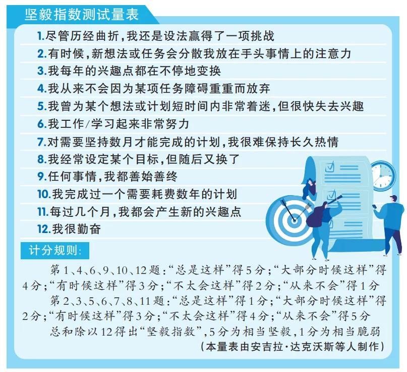 中國科學院心理研究所心理健康應用中心測評主管肖震宇表示,耐心應被歸爲一種人格特質,可通過A型人格測試、堅毅(GRIT)測試(如下圖)等來了解。