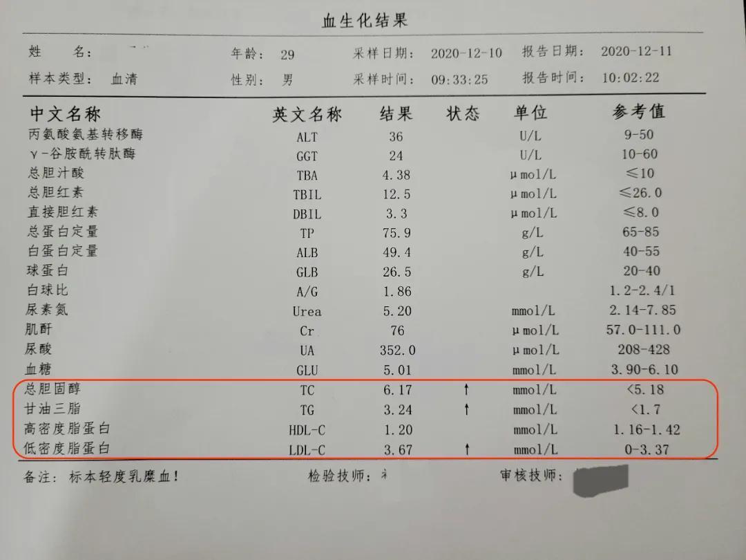 總膽固醇和低密度脂蛋白在邊緣水平,甘油三酯明顯升高(不同醫院參考值可能略有不同)