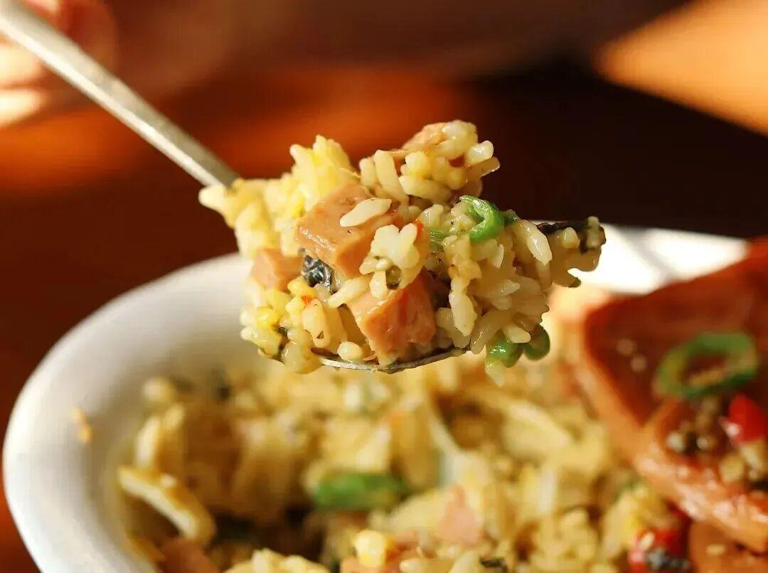 午餐肉切丁無油煎至焦脆;