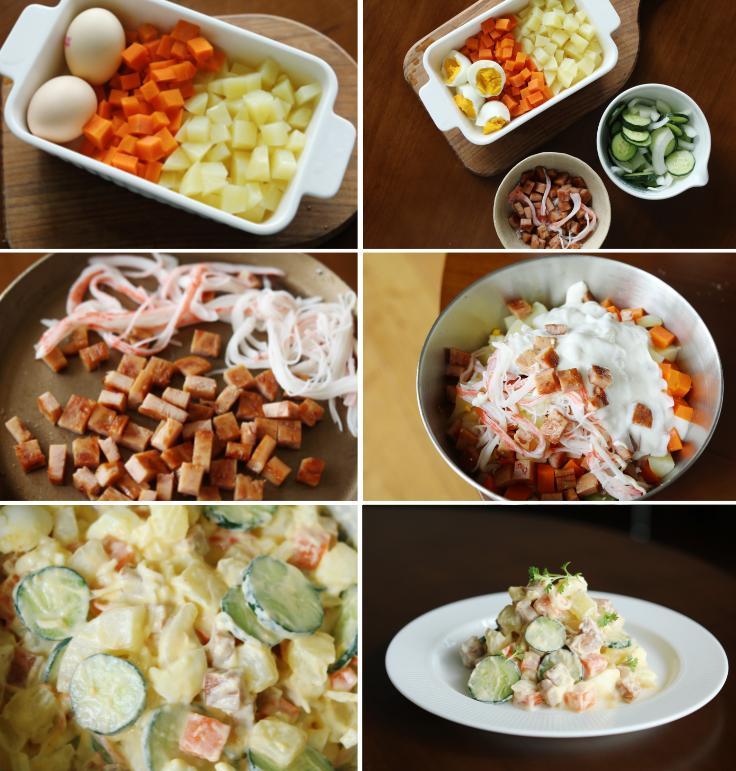 雞蛋煮熟,煎午餐肉和蟹柳;