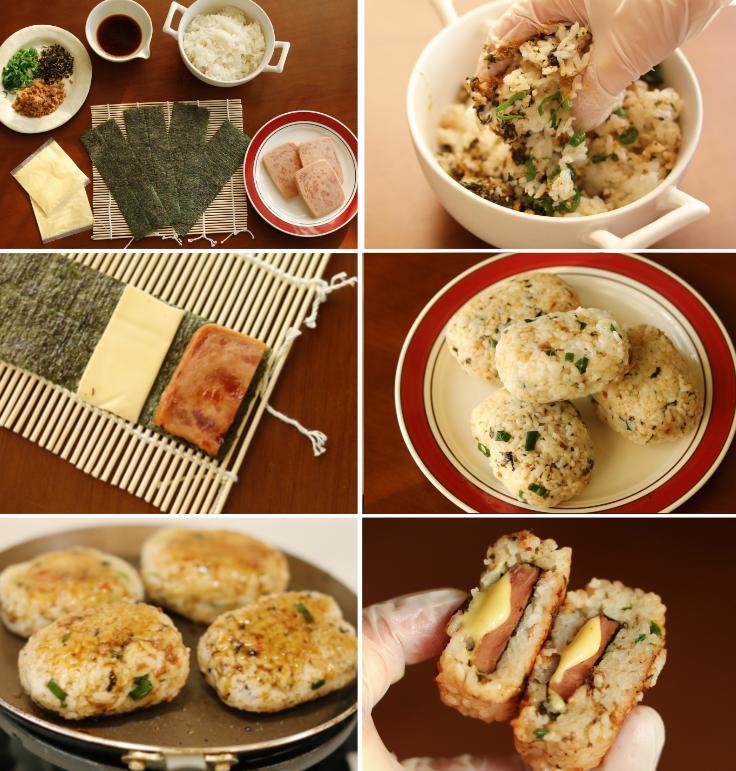 片狀海苔包上芝士片、午餐肉,用米飯包裹;
