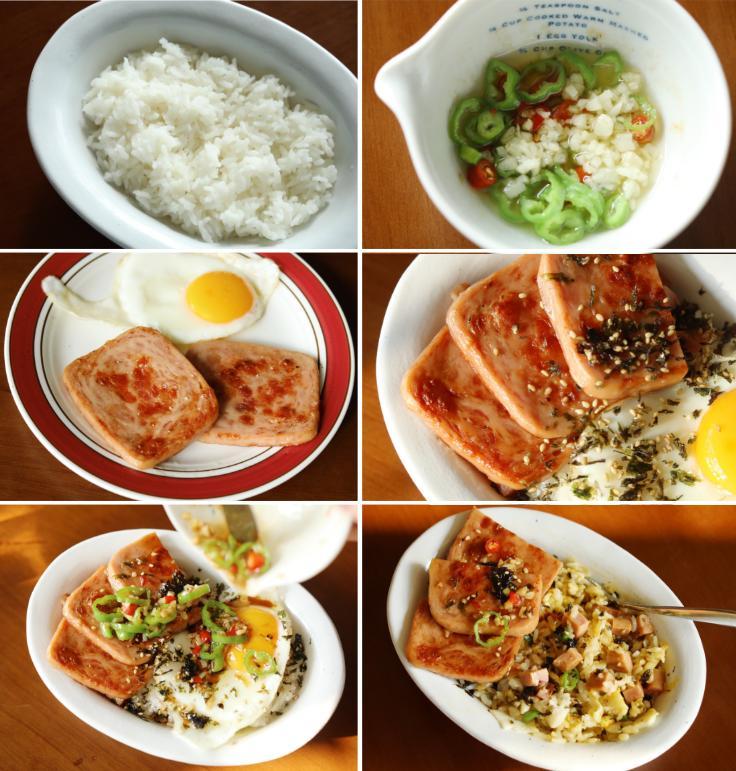 熱飯打底,碼上午餐肉 + 菠菜 + 青椒蒜醬 + 蛋,淋上醬汁撒海苔碎,開拌!