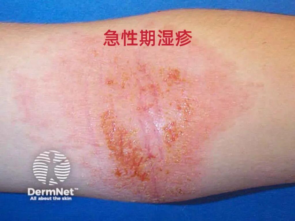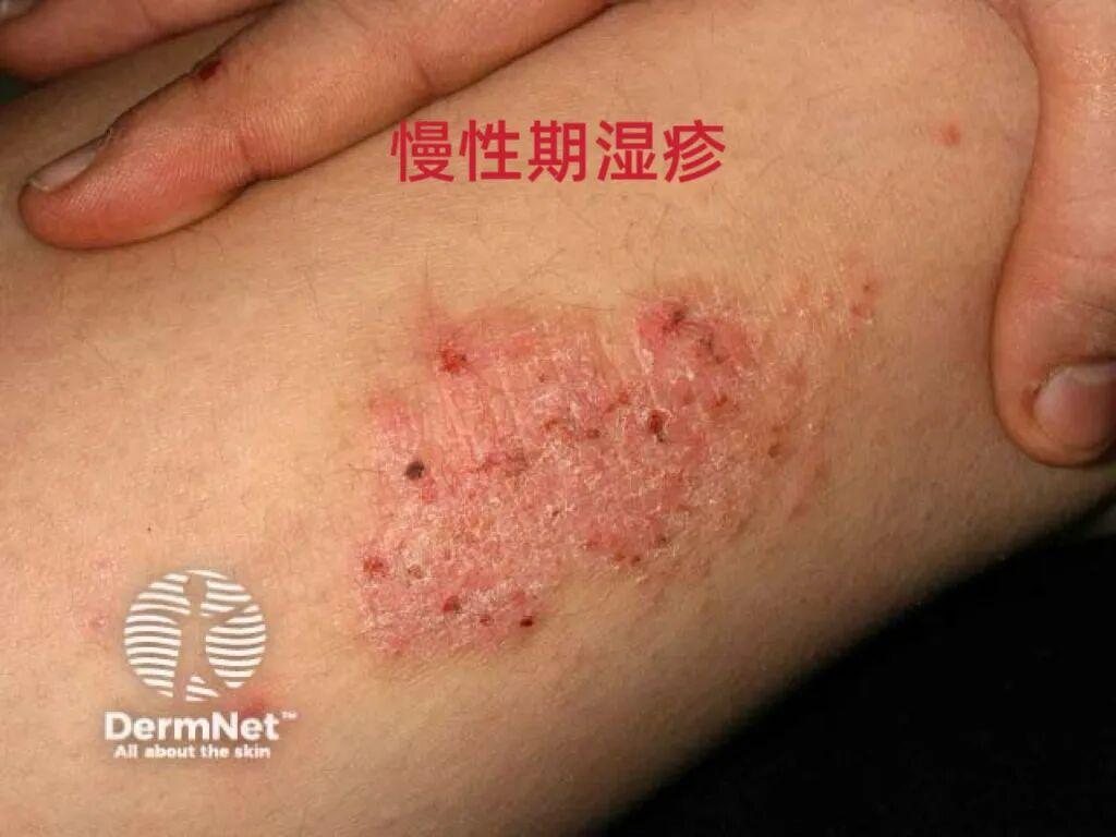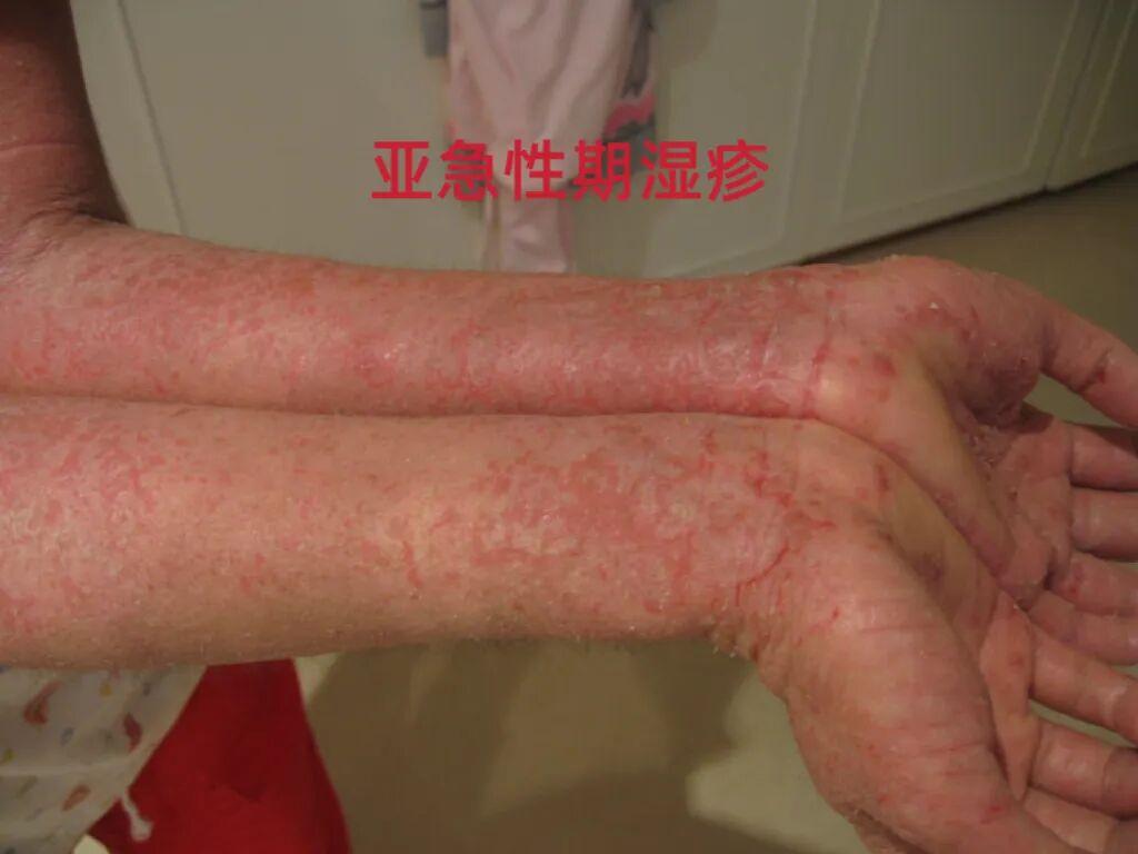 最初的紅斑、丘疹如果得不到控制,可能逐漸擴大,出現水皰、糜爛和滲液。如果急性溼疹反覆發作或遷延不愈,可能會轉爲慢性溼疹,表現爲皮膚增厚、粗糙、苔蘚樣變,瘙癢反覆發作,治療難度和病程都會顯著增加。
