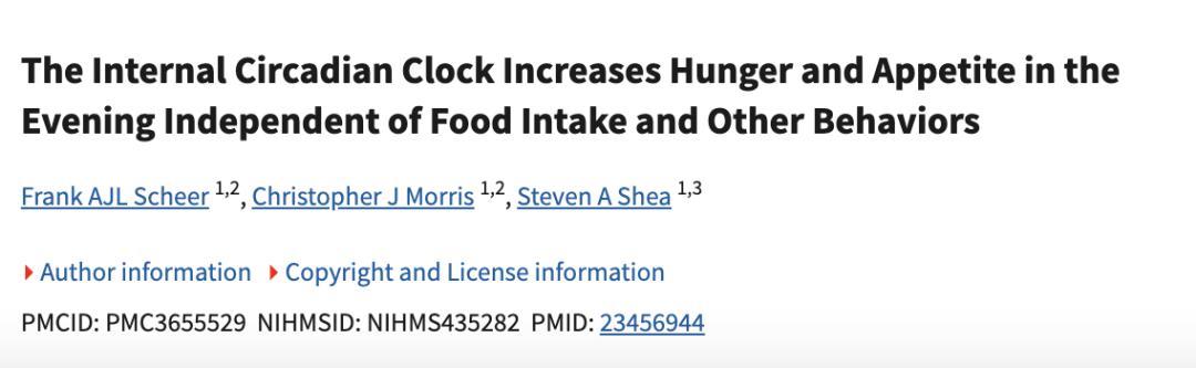 [10] Scheer FA, Morris CJ, Shea SA. The internal circadian clock increases hunger and appetite in the evening independent of food intake and other behaviors. Obesity (Silver Spring). 2013 Mar;21(3):421-3. doi: 10.1002/oby.20351. PMID: 23456944; PMCID: PMC3655529.