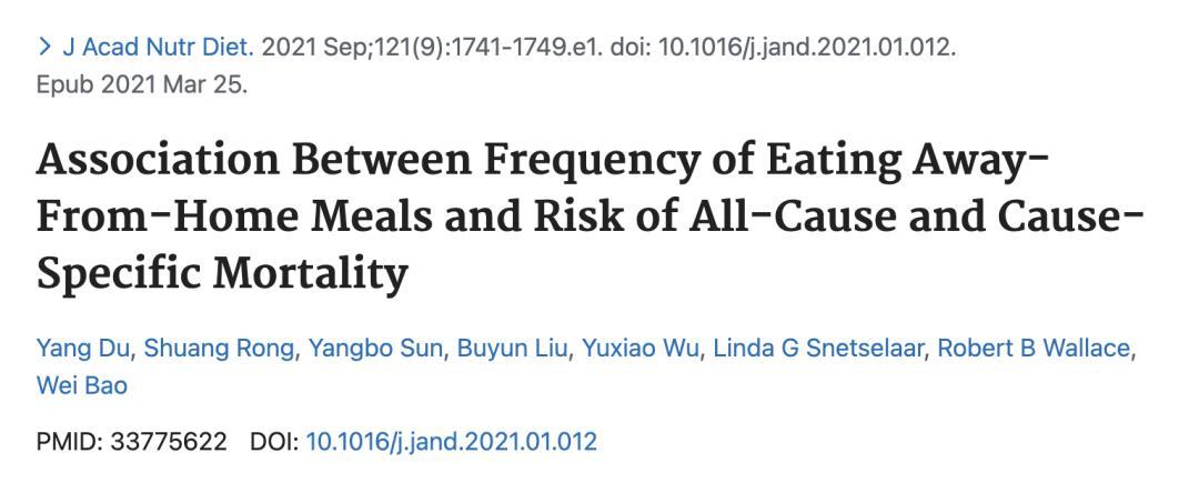 [1] Du Y, Rong S, Sun Y, Liu B, Wu Y, Snetselaar LG, Wallace RB, Bao W. Association Between Frequency of Eating Away-From-Home Meals and Risk of All-Cause and Cause-Specific Mortality. J Acad Nutr Diet. 2021 Sep;121(9):1741-1749.e1.