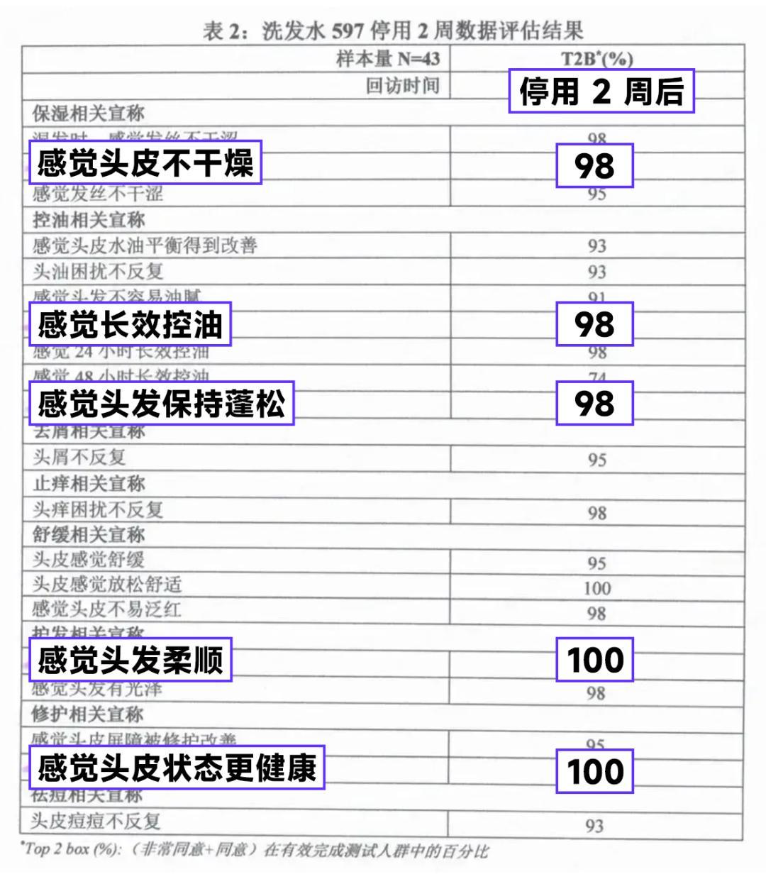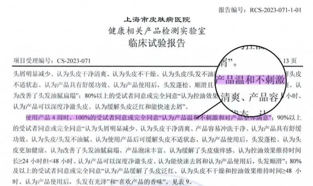 臨牀檢測報告顯示,單次試驗後 97% 以上的受試者認爲「頭皮/頭髮不油膩了」;94% 以上的受試者認爲「頭髮蓬鬆,油膩扁塌也有改善」。