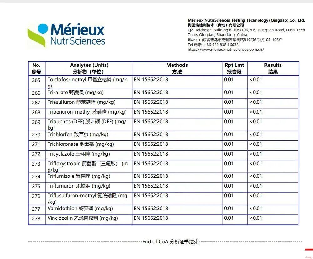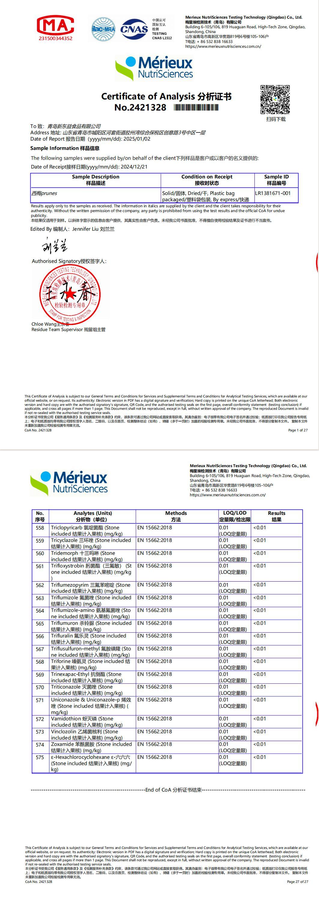 而我們的原料——西梅乾,作爲一款從智利進口的水果製品,共做了 500 多項農藥殘留檢測,報告顯示沒有檢出農殘!