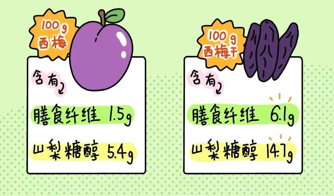 翻譯過來,西梅→西梅乾,膳食纖維佔比整整提高到 4 倍,山梨糖醇含量提高到了 2.7 倍!