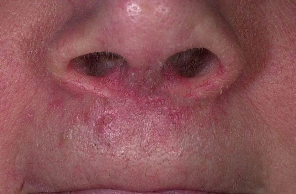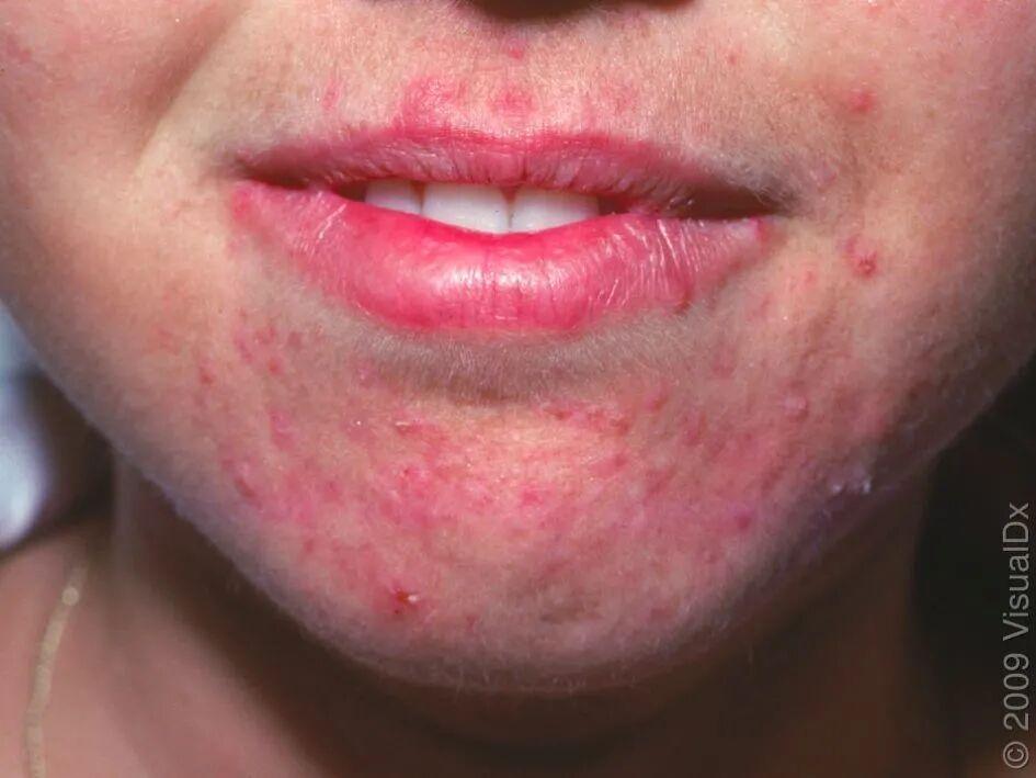 疾病特點:表現爲丘疹和膿皰,基底常有紅斑和/或鱗屑。常由外用糖皮質激素所致。常對稱分佈於口周,形成較清楚的紅色邊界,脣紅緣不受累。此外鼻周、眼周也可受累。確診通常無需檢查。