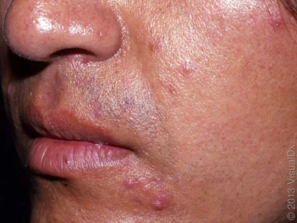 疾病特點:發生於長期使用抗生素治療的痤瘡患者,隨後在鼻孔前形成膿皰或結節並擴散。另外可發生於熱浴盆泡澡人羣及 HIV 感染患者。若常規抗生素方案治療無效,可行微生物培養。